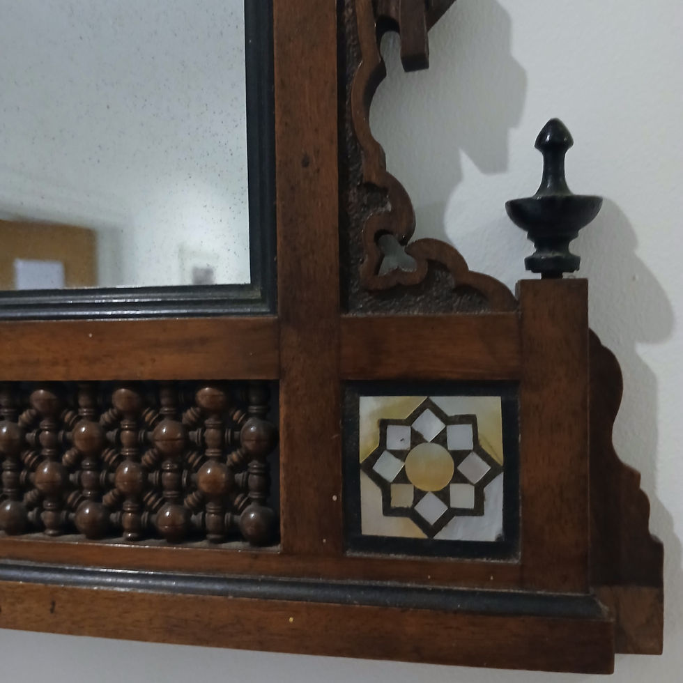 An Aesthetic inspired Moorish mirror circa 1900 possibly retailed by Liberty & Co. Carved/turned wood latticework to 3 panels with 4 mother of pearl 8 pointed stars and bobbin finials. The Arabic panel to top translates to 'God Bless The Creator'. In the Arabic traditional Mashrabiya architectural style. A gorgeous, highly detailed decorative antique mirror in lovely condition.