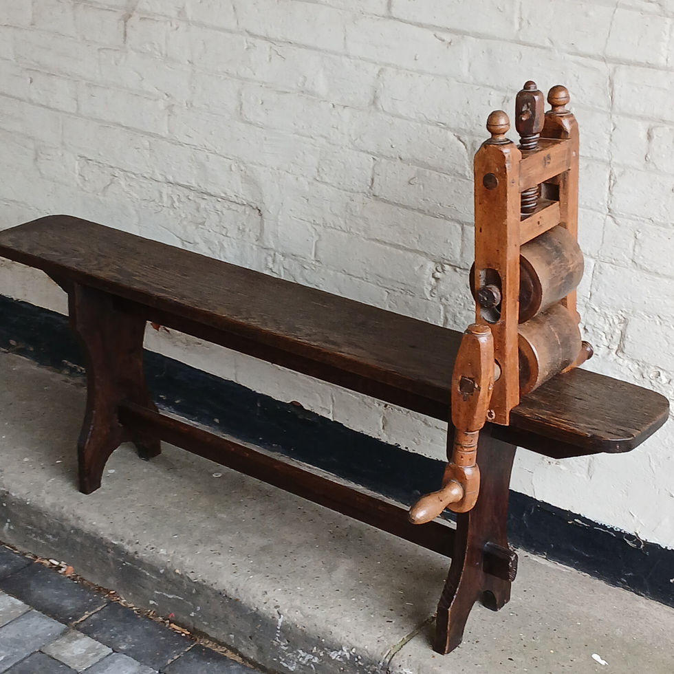 Here we have a French oak bench fitted with a 29th century splint mill, a roller for preparing straw, reed & cane prior to plaiting old seats and straw hats. Straw, reed & cane would have been steamed anbd bleached and then passed through the splint mill rollers several times where it was squeezed and flattened to make it suitably soft for plaiting. The gap between the rollers is adjusted using the super large wooden screw. A one off very tactile bench that is both functional & characterful and sure to provoke questions.
