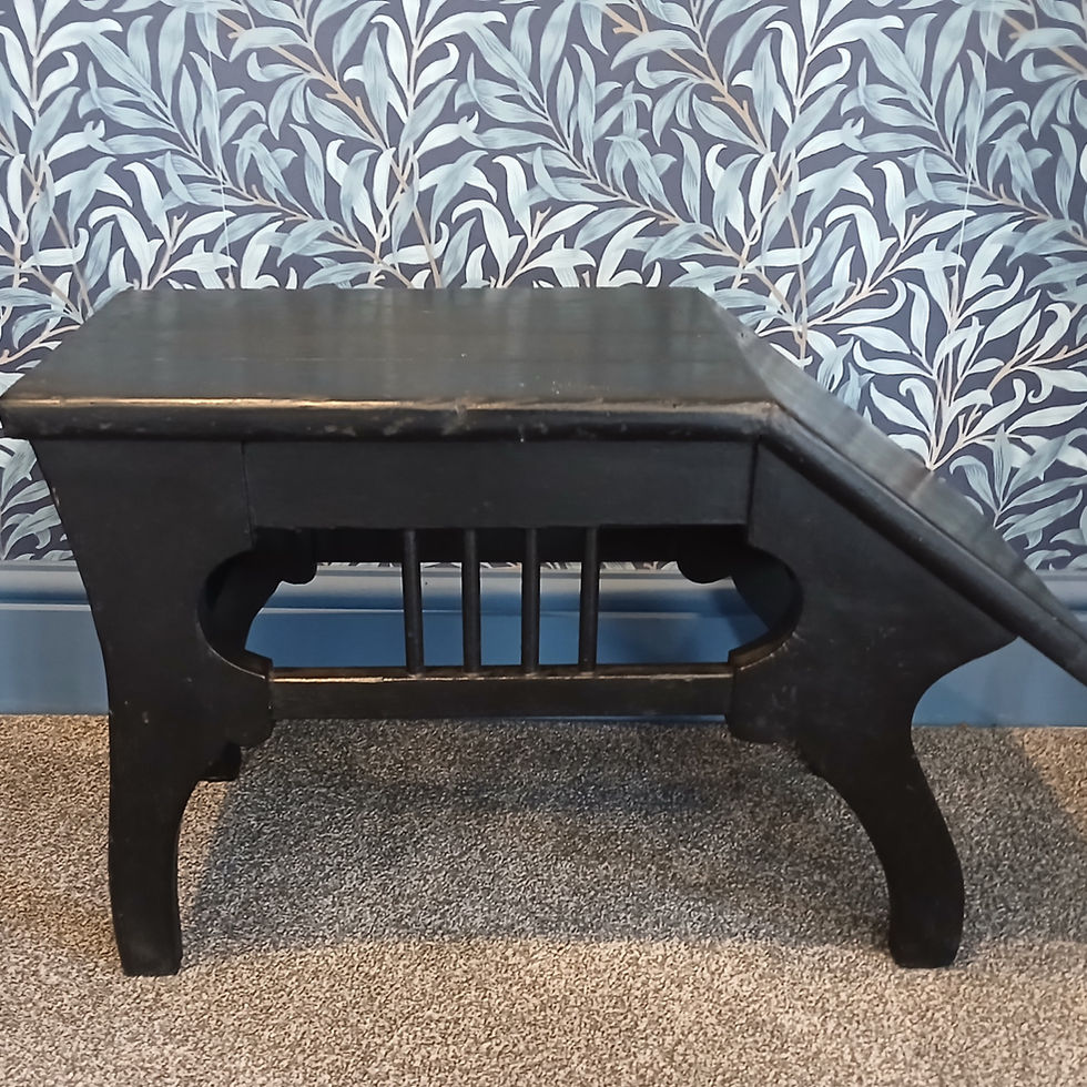 A nicely detailed ebonised antique shoe shop fitting stool with decorative spindled vertical bars and curved legs. a nice interior design piece that could be used as a stool or as a character side table with a good flat surface area to top.