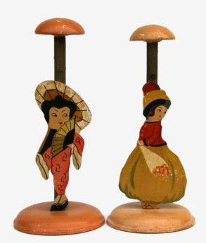 A pair of early 1900s beautifully painted hat stands. One in the form of a Japanese Geisha Girl and the other looks to be a Dutch Girl holding flowers. Extremely decorative & rare item. Sold as a pair.