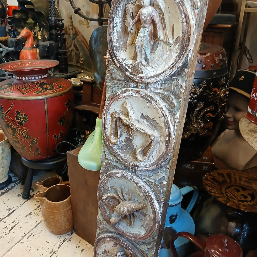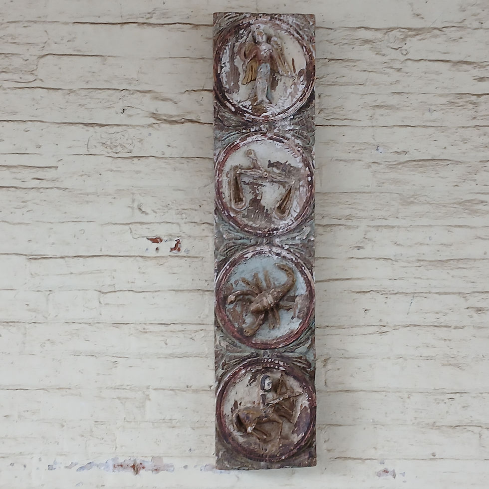 Early heavily carved wooden relief polychrome panel featuring 4 signs of the zodiac, from top to bottom Gemini (Angel), Libra (Scales), Scorpio (Scorpion) & Sagittarius (Archer). Likely originating from Spain this extremely decorative piece hand carved on a thick plank would make a beautiful and unique gift. Beautiful polychrome colour & aged patina makes this a real statement piece.