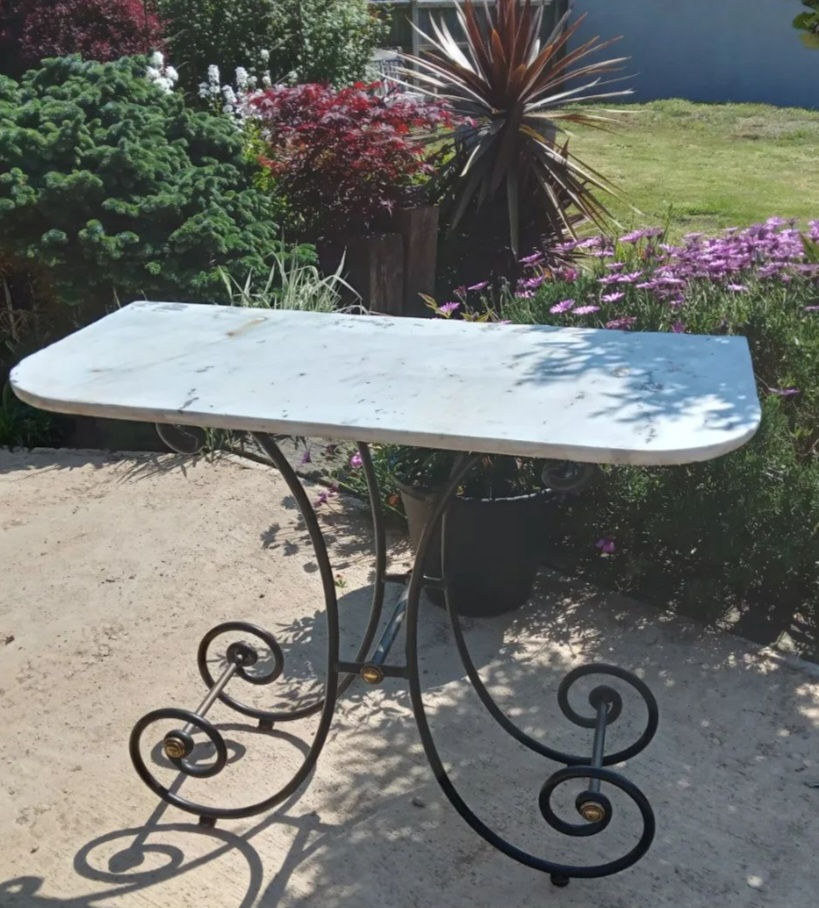 A French Boulangerie style iron based table with an original antique marble top, this style of table is extremely popular and makes an extremely decorative hall or console table. Originally used by French bakers to display their breads and patisseries. In super condition and very solid, heavy but the top being removable for transport. 92cm width, 43cm depth, 75cm height.