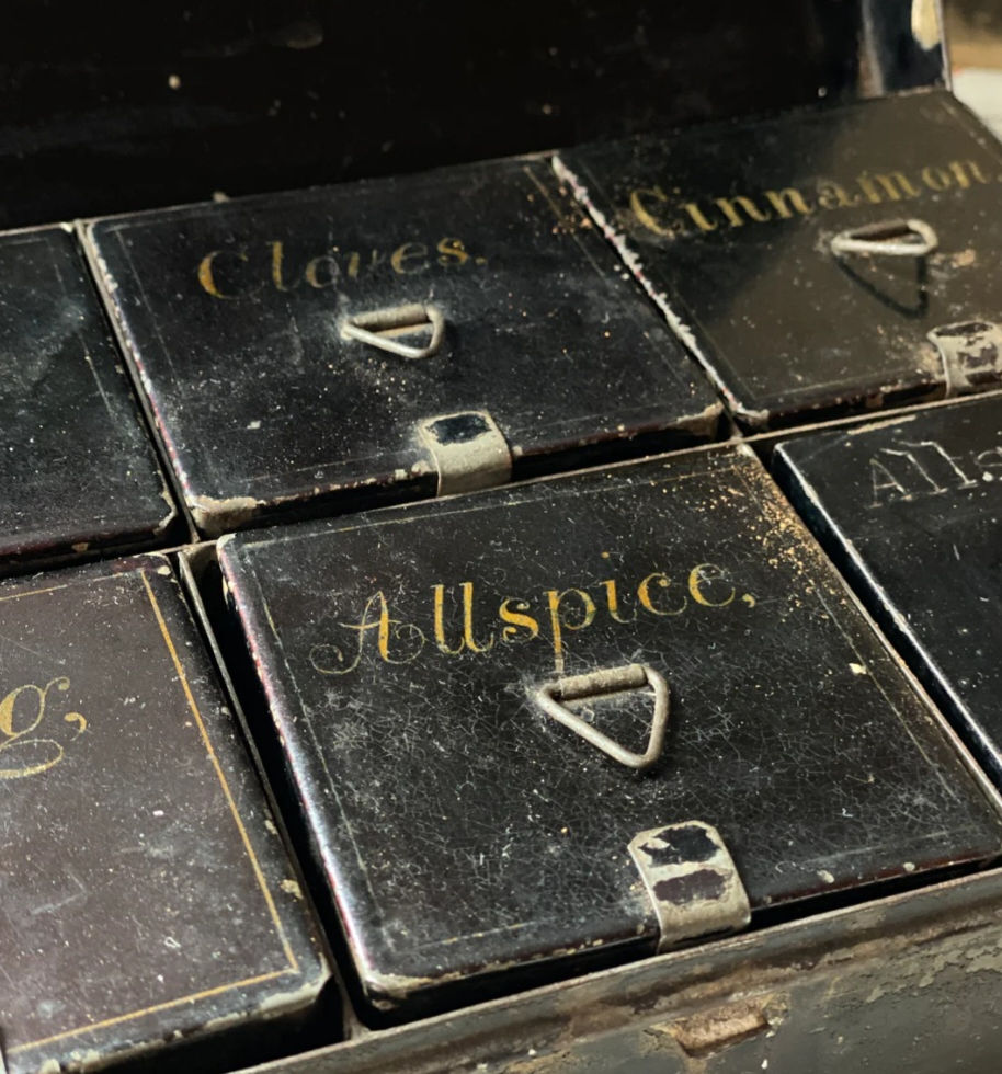 An early piece of kitchen history circa 1830, a Georgian toleware spice tin with 6 individual tin compartments inside which can be removed via the small ring handles. Featuring the names of the type of spice to the top of each compartment in lovely gilt writing.