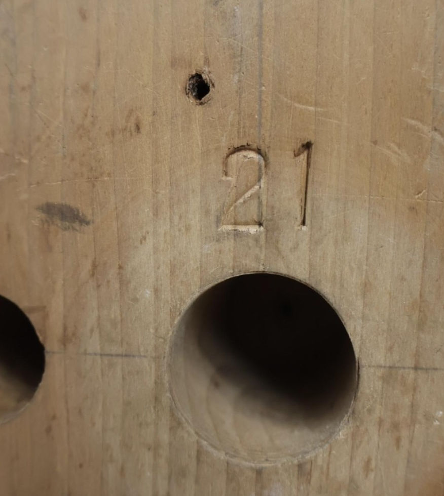An early 20th century, antique wooden Milliners hat block, likely originating from England or France in the early 1900s. It consists of a carved wooden form (removable) which sits on a matching stand. These were originally used for shaping or displaying hats. The size of the form is stamped to the base 21.