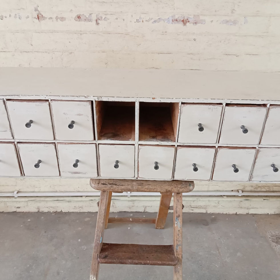 An extremely characteful dovetailed painted 14 drawer cabinet with 2 pigeon holes