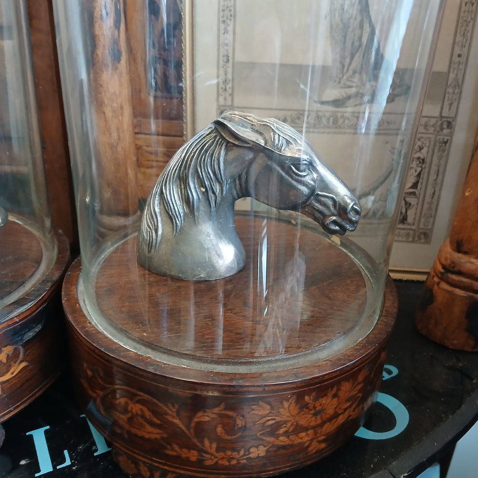 A wonderful matched pair of 19th century French tall glass domes with beautifully decorative inlaid marquetry bases. Displayed in the last few photos with a pair of 1920 French decorative bottle openers in the form of a Mallard duck and a horses head. Priced as a pair (2).