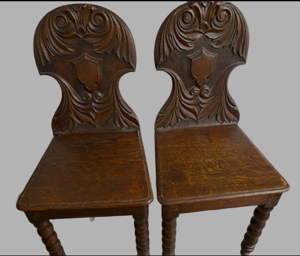 A beautiful pair of Victorian shield back hall chairs, circa 1880, with bobbin legs.