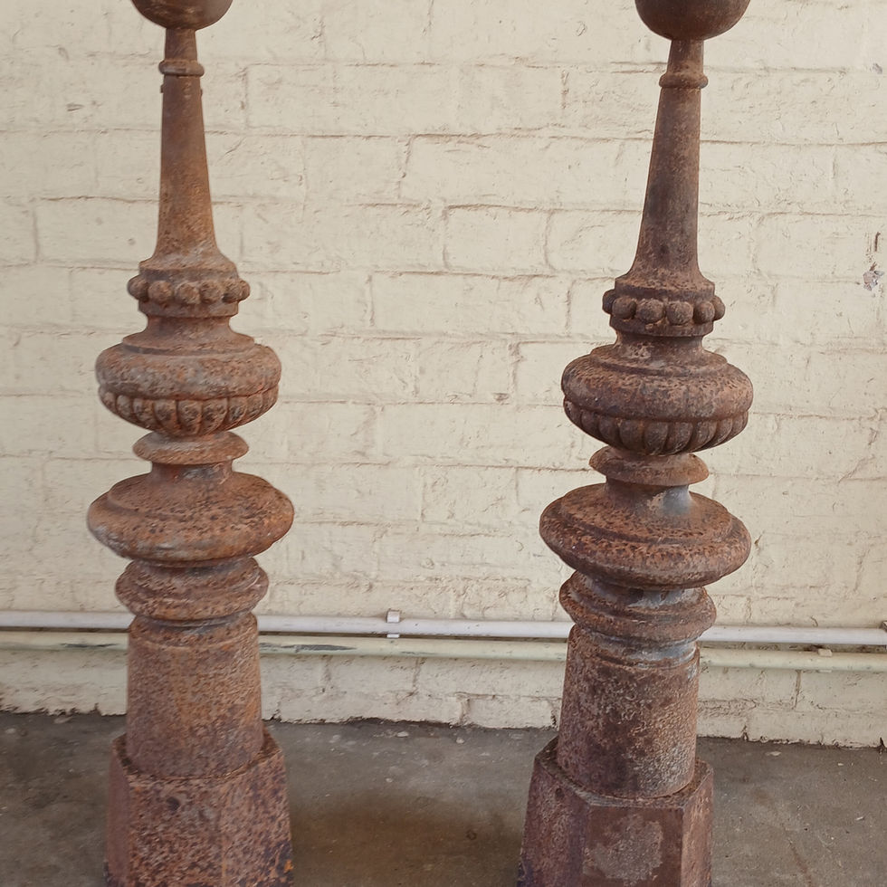 A truly stunning pair of architectual highly detailed French antique cast iron finials, each standing 80cm tall, on hex bases. Super decorative inside or out and the rounded hollow tops could also house candles. Great to find a matching pair, rare and unique, sitting on the floor, a sideboard framing an antique mirror or however you see them. Untouched and with a great patina which is how we like them but could easily be cleaned up if required. Sold as 1 pair (2).