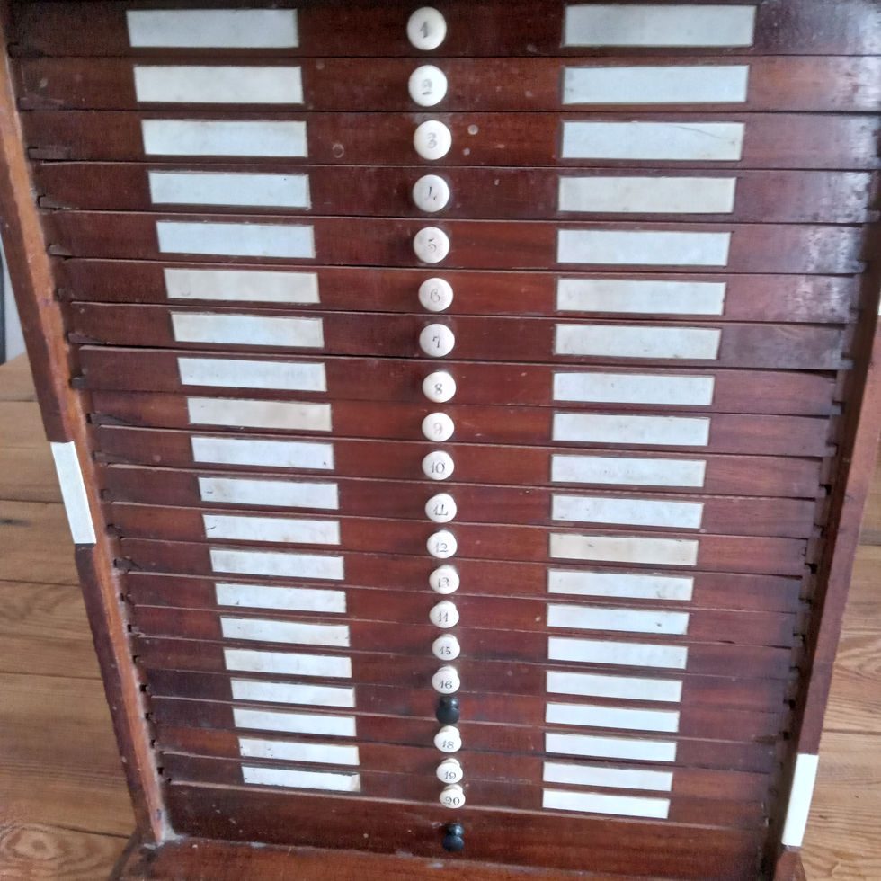 Nice Victorian 21 Drawer Slide Cabinet with beautifully numbered white handles & name plaques. Originally this would have had a door to front and the hinge & lock recesses have had white plate covers similar to the name plaques. An extremely heavy and solid piece in overall very good condition for age which will likely now be used for small crafts or just as an extremely decorative feature piece.