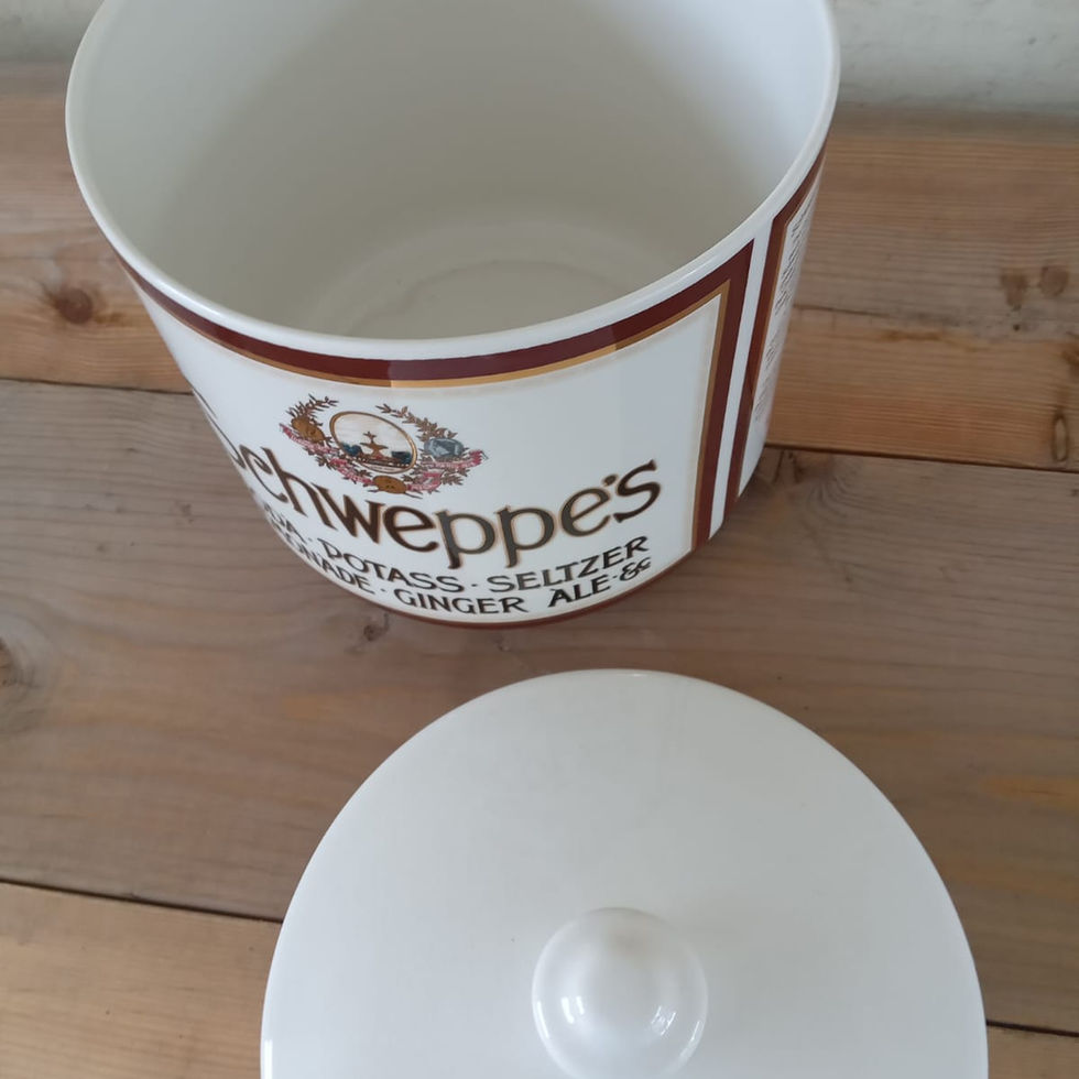 A rare vintage Schweppes advertising ceramic ice bucket in stunning & I would say unused condition. Made by Crown Windsor. Extremely decorative with the history of Schweppes and their products.