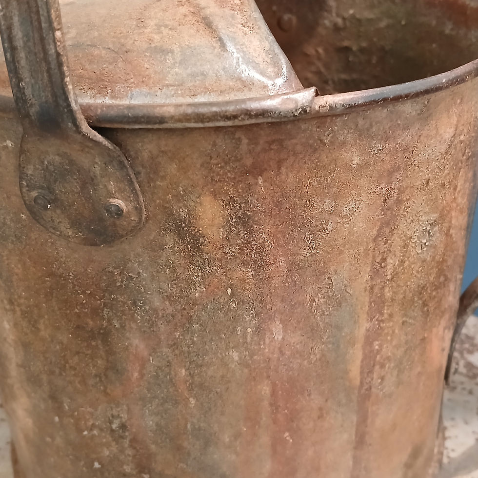 This early watering can has a beautifully rich patina and is in super solid condition throughout. Heavy duty quality watering can with riveted handles. I see this now as an interior decorative piece that would look stunning with dried flowers